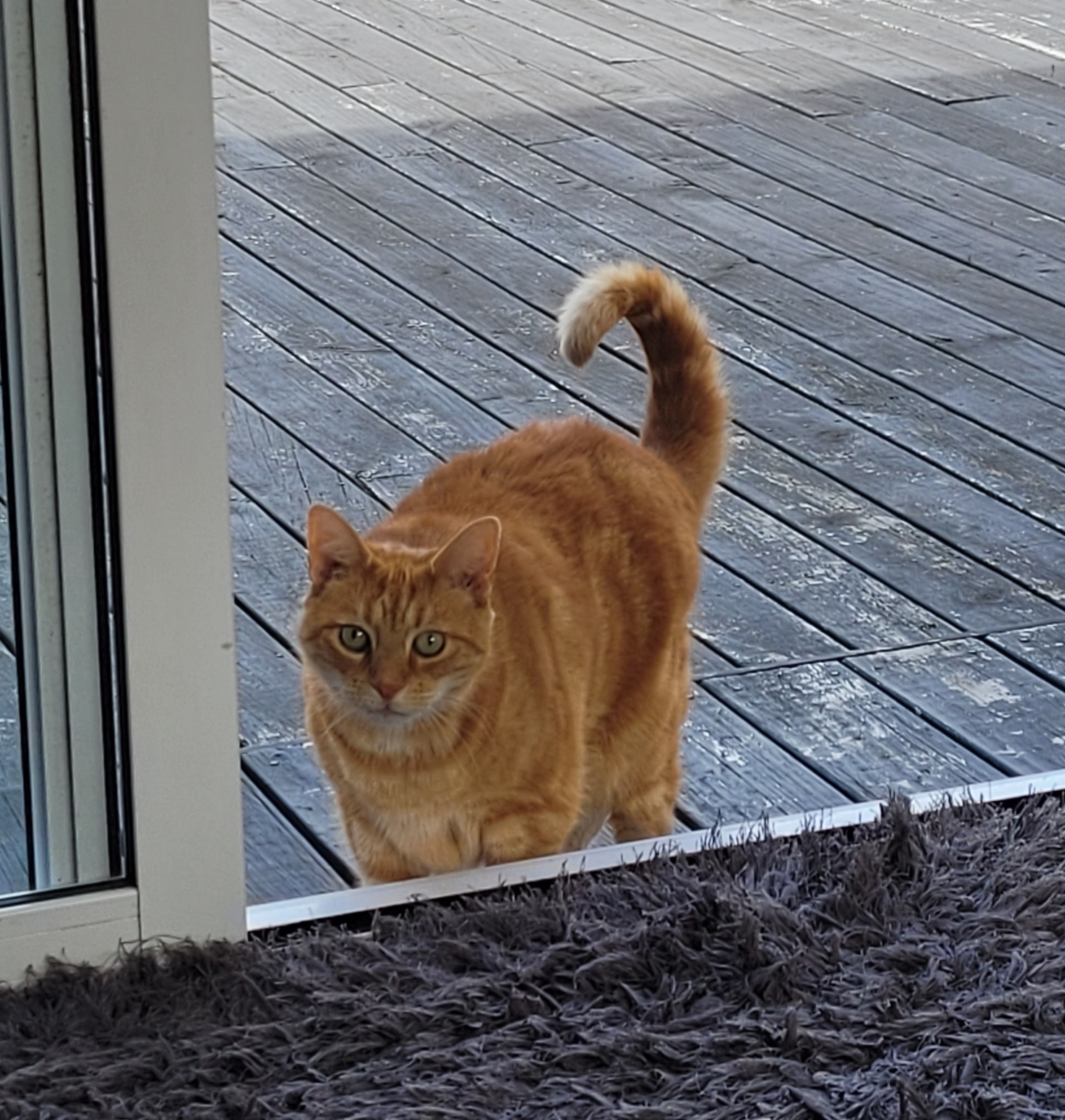 He was tentative at first. I’d catch him trotting across the section, giving us the side-eye. He got a little bolder, loitering on the edge of the deck, even making his way furtively to the sliding door. One day I opened the door, reached out, was able to lure him briefly with a pat on the head.
