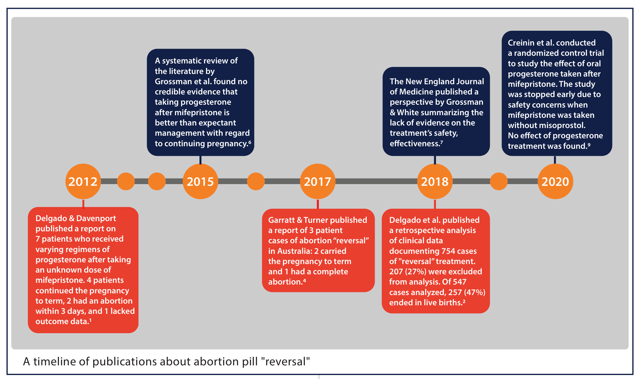 [Picture credit: A timeline summarising the science behind abortion reversal, with the real science above and the crappy science below. Taken from a July 2020 issue brief by Advancing New Standards in Reproductive Health.]