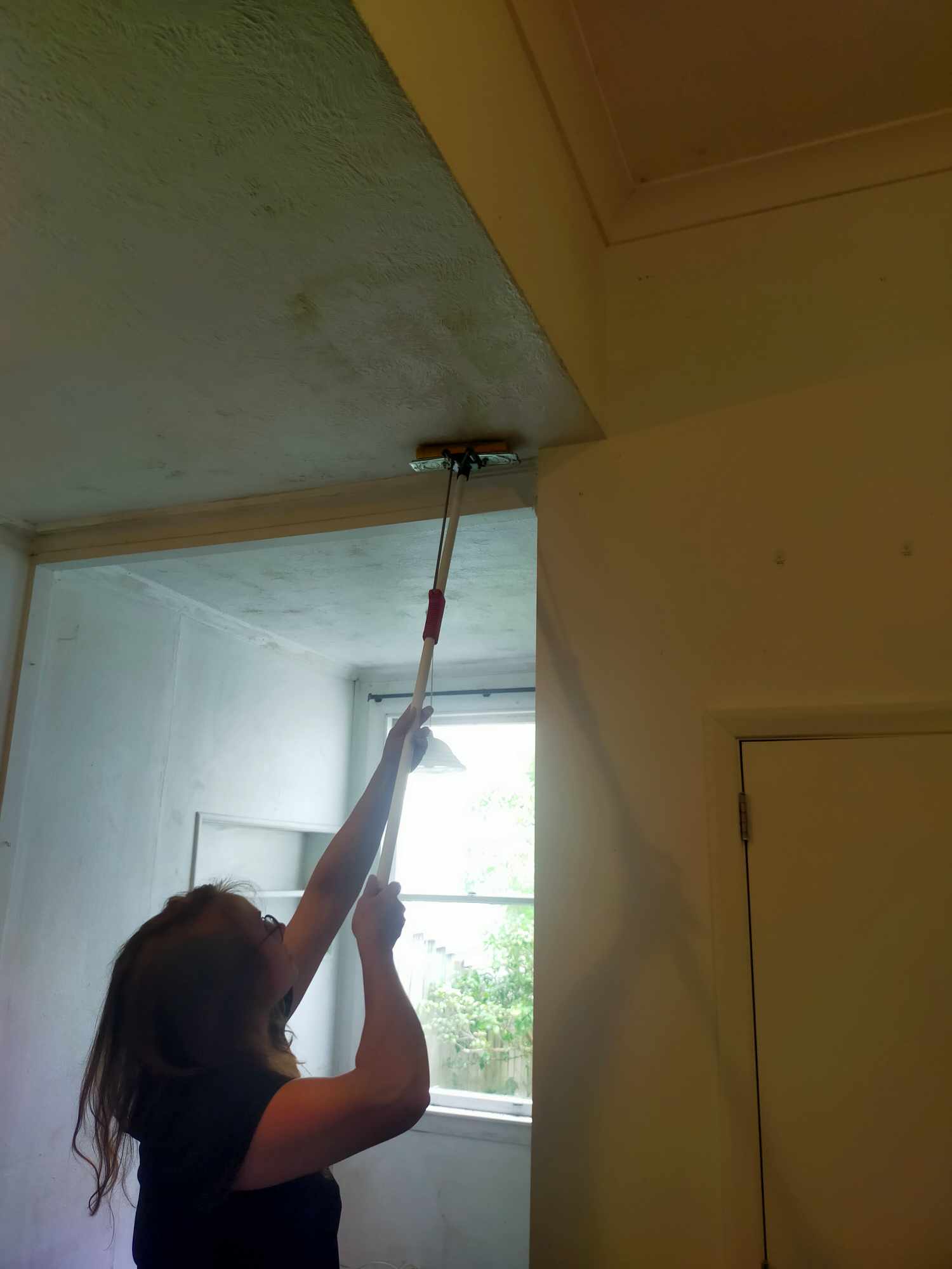 [Photo description: Here I am, cleaning mould from the ceiling with a squeegee mop. The shot’s angled so you can’t see my face contorted with rage]