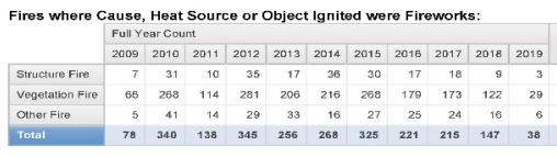 This data shows fires caused by fireworks, most of which are bushfires. You’ll see that we were relatively sensible in 2009, before a period of national stupidity lasting up to 2017 - the worst year seeing 345 fires. This came down in 2018, and down much further in 2019, to a low of 38. It’s pretty hard to say whether this is the start of a good thing, or simply a blip.