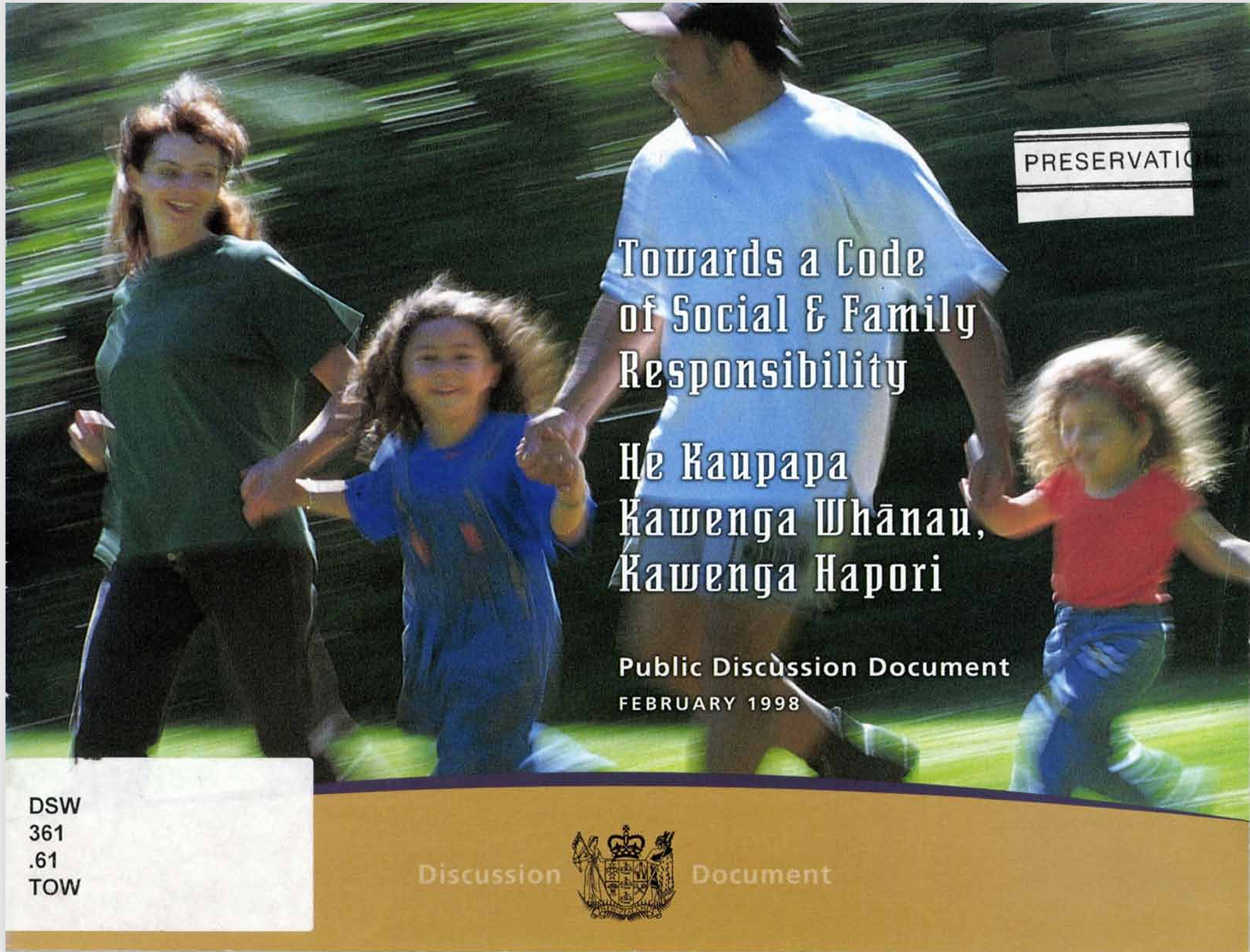 [Imagine description: This is the cover of Towards a code of social and family responsibility. The imagery is a two-parent family, who appear to be Māori or Pacific, joining hands and skipping towards middle-class respectability. Sigh.]