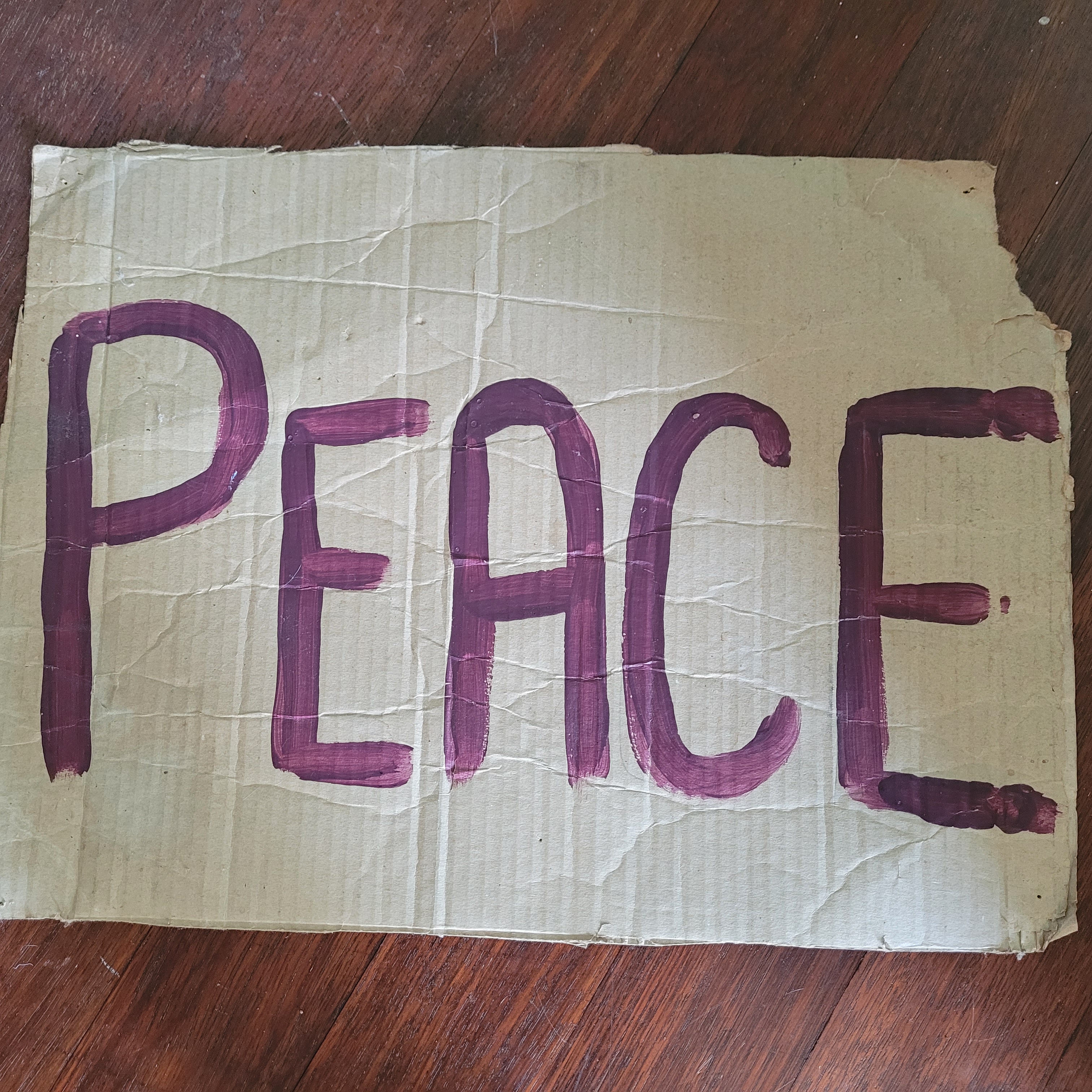 This sign is saved from almost twenty years ago, when my oldest was a baby. The invasion of Iraq was imminent. Three generations of my baby’s family marched: baby, mum and dad, and aunts and grandma on dad’s side. Grandma was nearing the end of her life. She had cancer, and in the middle of an enormous crowd, was frail and vulnerable and confused. And she marched anyway. This was baby’s sign, propped on the pram.