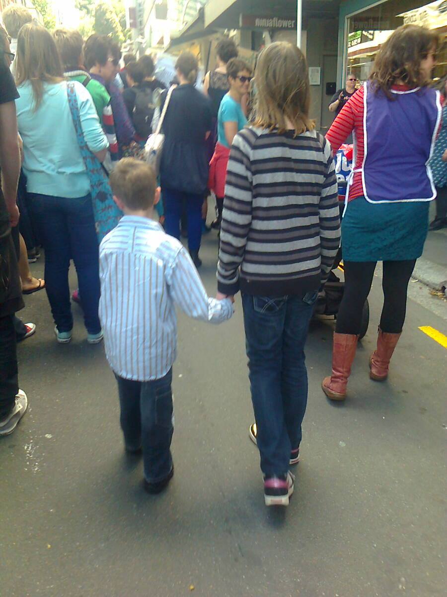 These are my kids in 2013, hand in hand, protesting the police’s handling of the Roastbusters case. The older kid had just turned 12. He took a bit of chalk and wrote on the footpath outside the police station, “It’s never the victim’s fault”. That’s right: both freakin apostrophes in the CORRECT PLACES. It was at this point I realised I’m probably the best parent in the world.