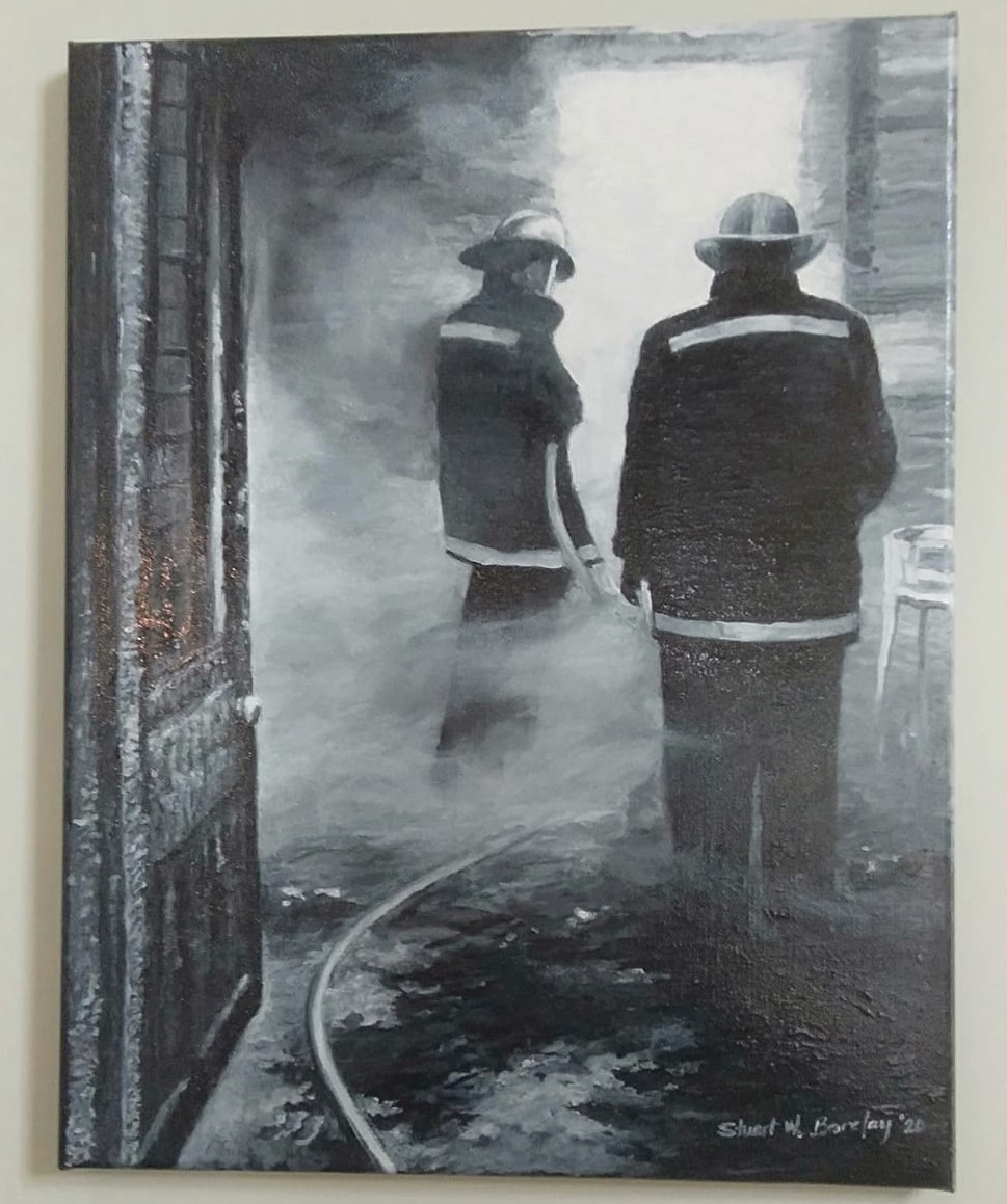 This painting is by one Stu Barclay, an ex-fireman who served with my father. The painting was reproduced from a Southland Times article in the 80s, and features my father and his colleague. The fire was extremely serious - hence the newspaper coverage - although I’m unsure whether it was a fatality. The lack of breathing apparatus shows the photo was taken at the point of clean up after the fire.