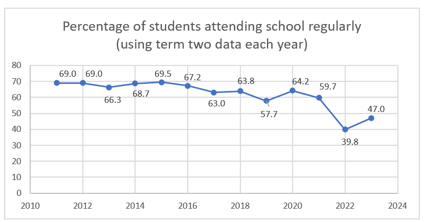 Note that until a few years ago, the Ministry of Education collected only term two attendance data (not sure why) so I’ve used term two across each year for consistency. ↩Missing Out - Why Aren't Our Children Going to School - Summary.pdf ↩
