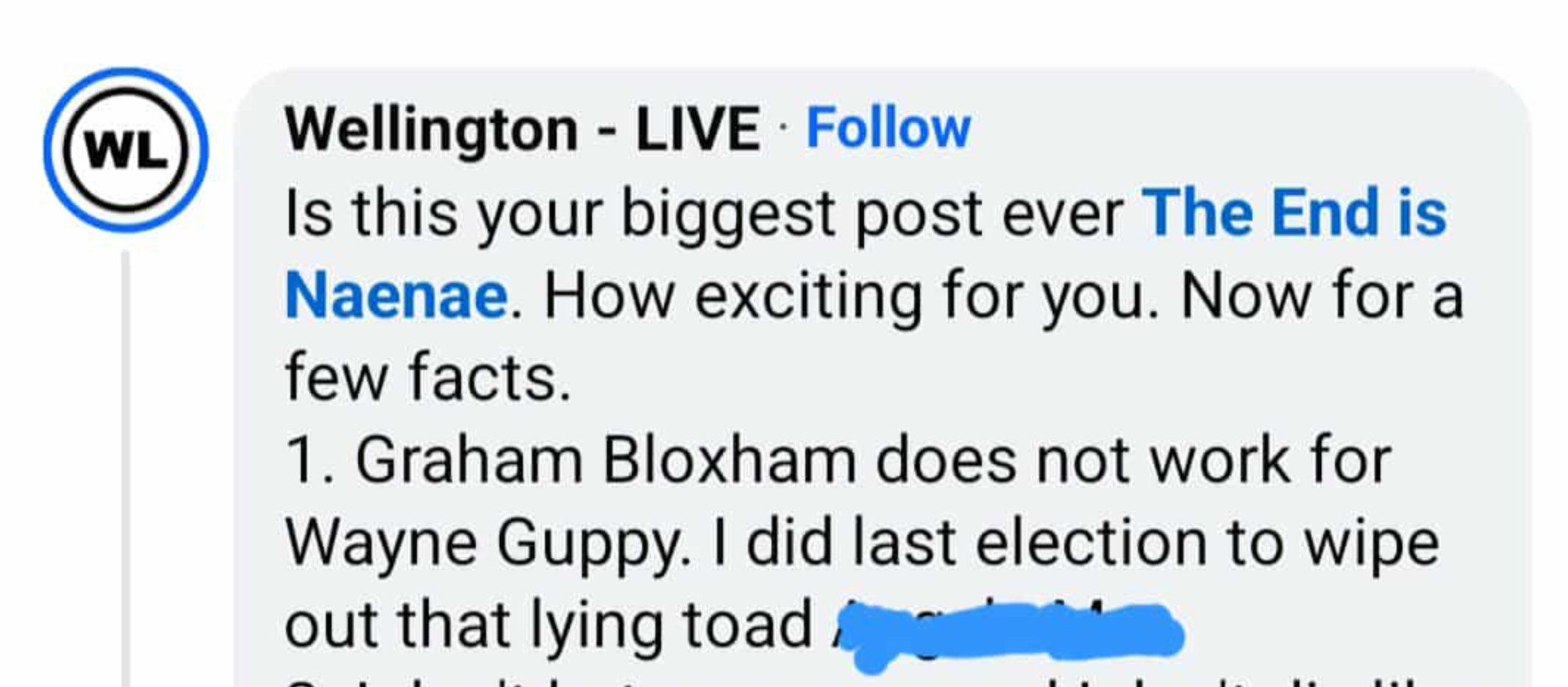 The Spinoff has documented how in the 2022 local body elections, the current mayor of Upper Hutt, Wayne Guppy, paid Bloxham-owned media companies almost $10,000 for ‘social media’ and ‘advertising’.2 It’s not clear what exactly this money bought Guppy, but over the last few days, Bloxham left me a comment describing how he sees his work for Guppy as follows.