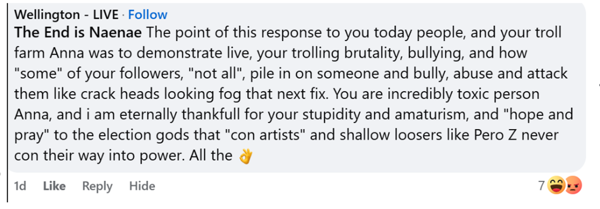 But there’s a special kind of discomfort as a female target. My own experience started mid-year. Wellington LIVE, a dystopian shitfest of a Facebook page owned by Bloxham, started going through and liking my historical Facebook posts. It was weird and uncomfortable, but life as a woman with a voice and connection to politics is always weird and uncomfortable, so I got on with it.