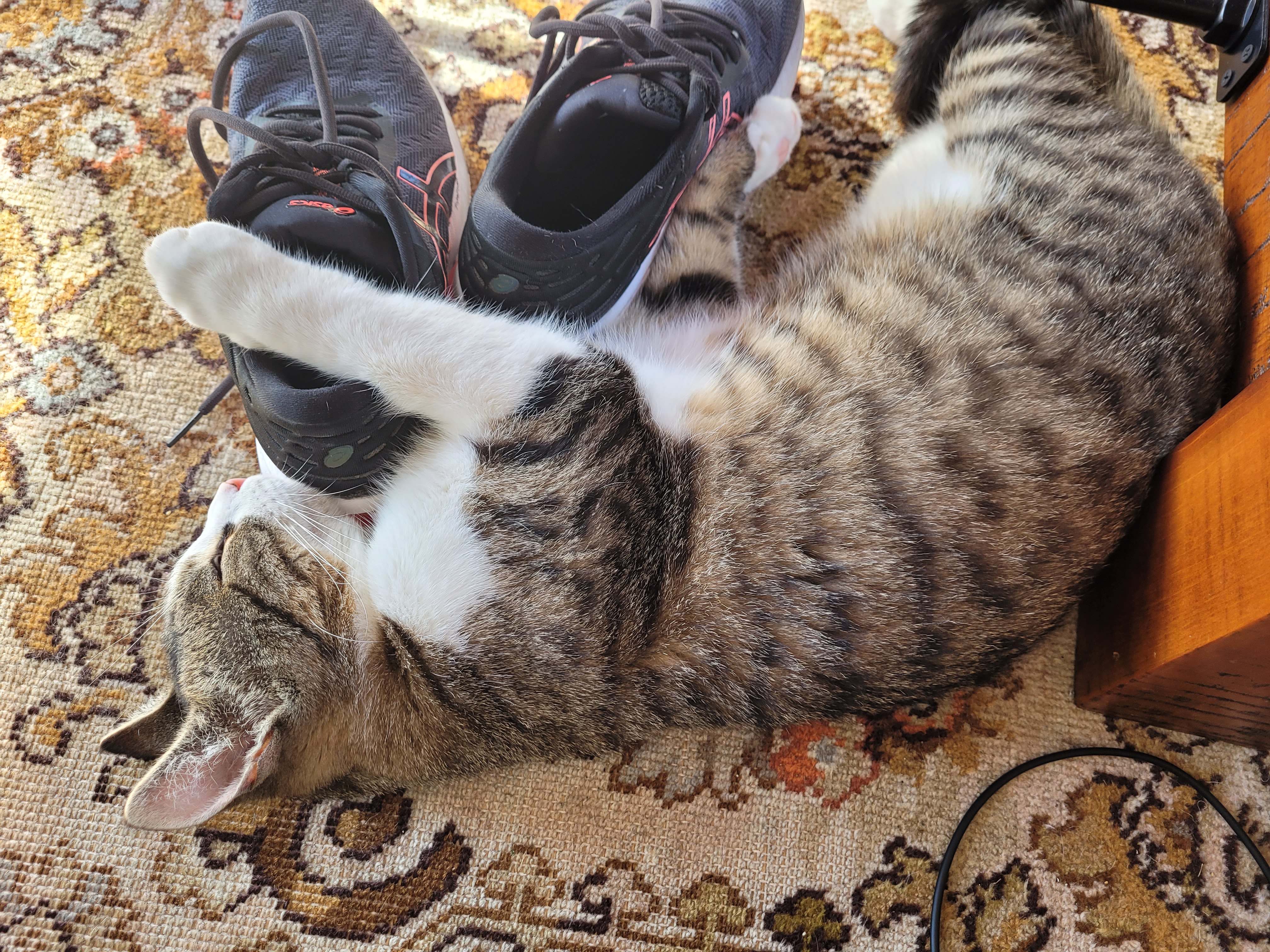 While you're here, this is a picture of my late dick of cat, asleep and hugging my running shoe on my 90s carpet.